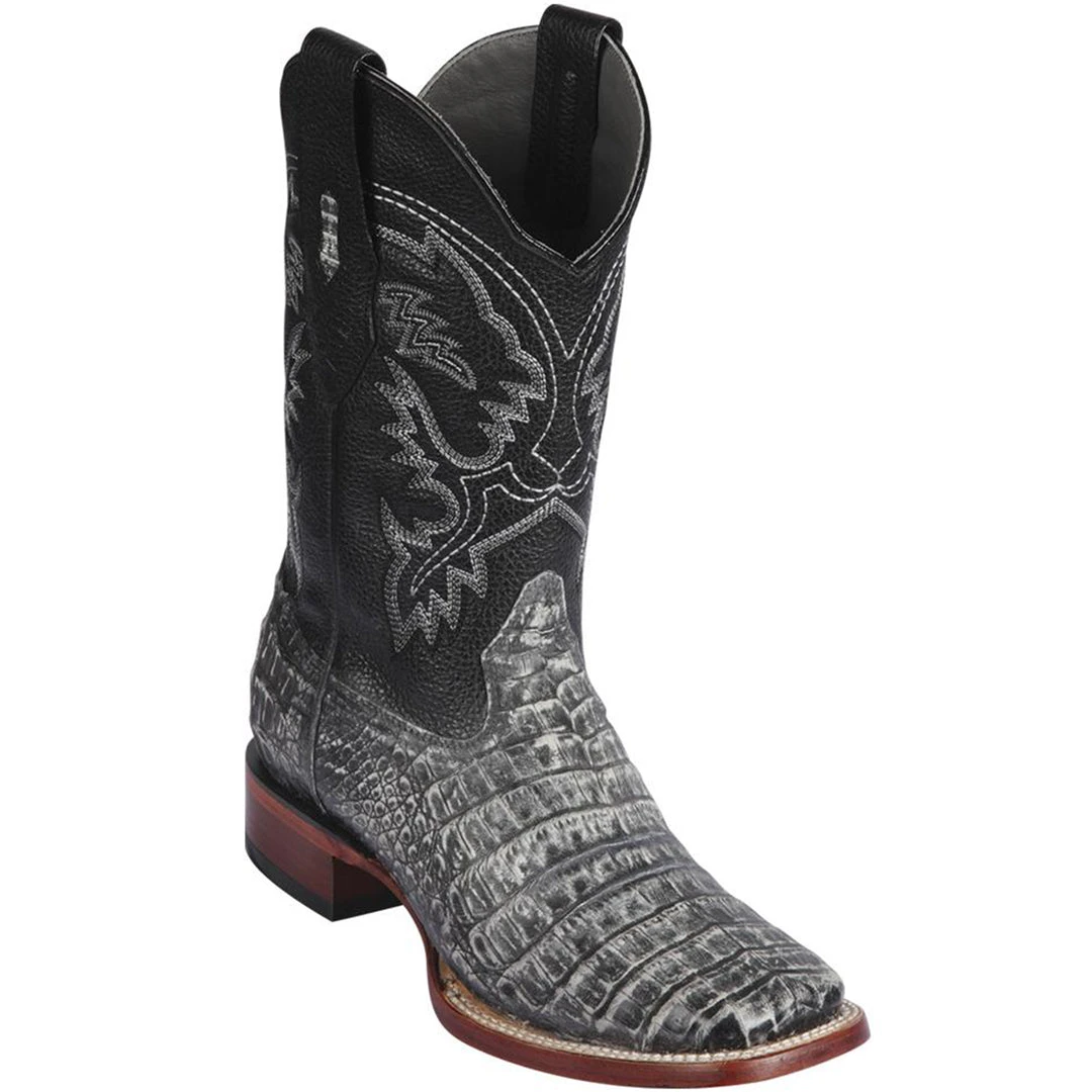Los Altos Mens Sahara Rustic Black Caiman Belly Square Toe Cowboy Boots.